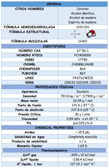 El compuesto químico metanol, también conocido como alcohol de madera o alcohol metílico (o rara vez alcohol de combustión), es el alcohol más simple. A temperatura ambiente aparece como un líquido ligero (baja densidad), incoloro, inflamable y tóxico que se utiliza como anticongelante, disolvente y combustible. Se usó en el proceso de embalsamamiento, pero los antiguos egipcios usaban una mezcla de sustancias, incluido el metanol, que obtenían por pirólisis de madera. El metanol, como todo el alcohol, tiene varios usos. Es un solvente industrial y se utiliza como materia prima en la fabricación de formaldehído. El metanol también se usa como anticongelante para vehículos, combustible para estufas de campamento, solvente de tinta, tintes, resinas, adhesivos, biocombustibles y aspartamo. También se puede agregar metanol al etanol para que no sea apto para el consumo humano (el metanol es altamente tóxico) y para los modelos de vehículos con motores de combustión interna.