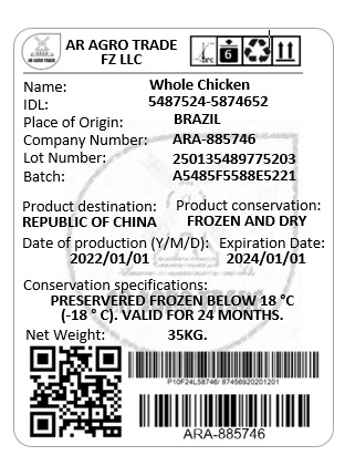 Pollo entero, eviscerado, categoría "A", sin menudencias. Libre de plumas, golpes, de coloración uniforme, con las panojas correspondientes. Empacado individualmente en bolsas de polietileno. Producto sometido a ultracongelado, tapado, encajonado y etiquetado según necesidades del cliente.